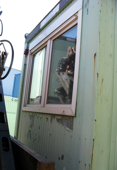 Konstrukce je tvořena samonosným ocelovým rámem, vnější plechy jsou pozinkované a lakované zelenou barvou, interiér lamino desky ve světlé barvě, je tepelně izolovaný, podlaha lino, plastová okna, plechové vstupní dveře, elektroinstalace, jističe, osvětlení, vypínače, zásuvky. Kontejner má technické závady, patrné z fotodokumentace. Tento obytný kontejner má za vstupními dveřmi malé zádveří, pro úsporu vytápění v zimním období.
